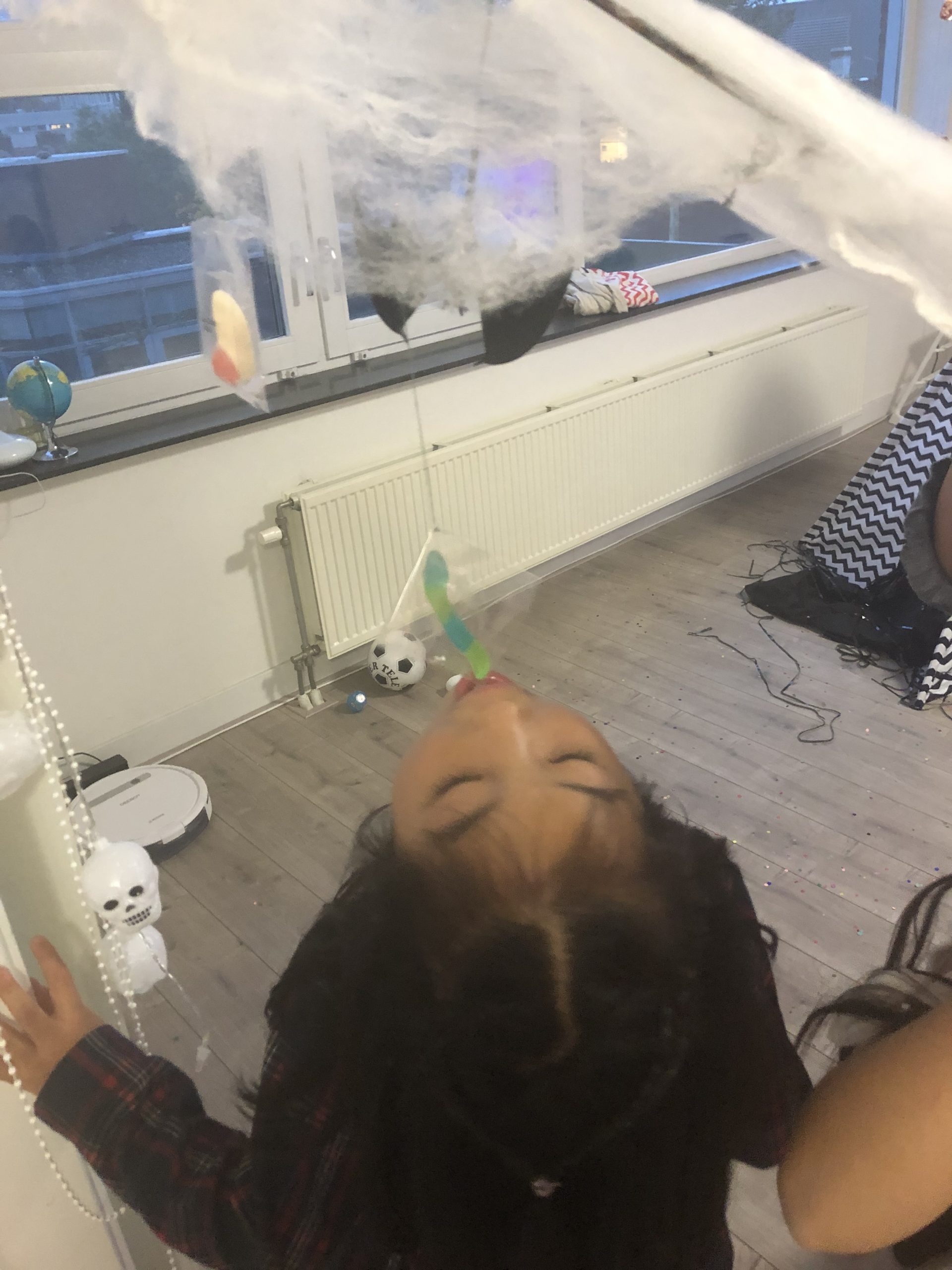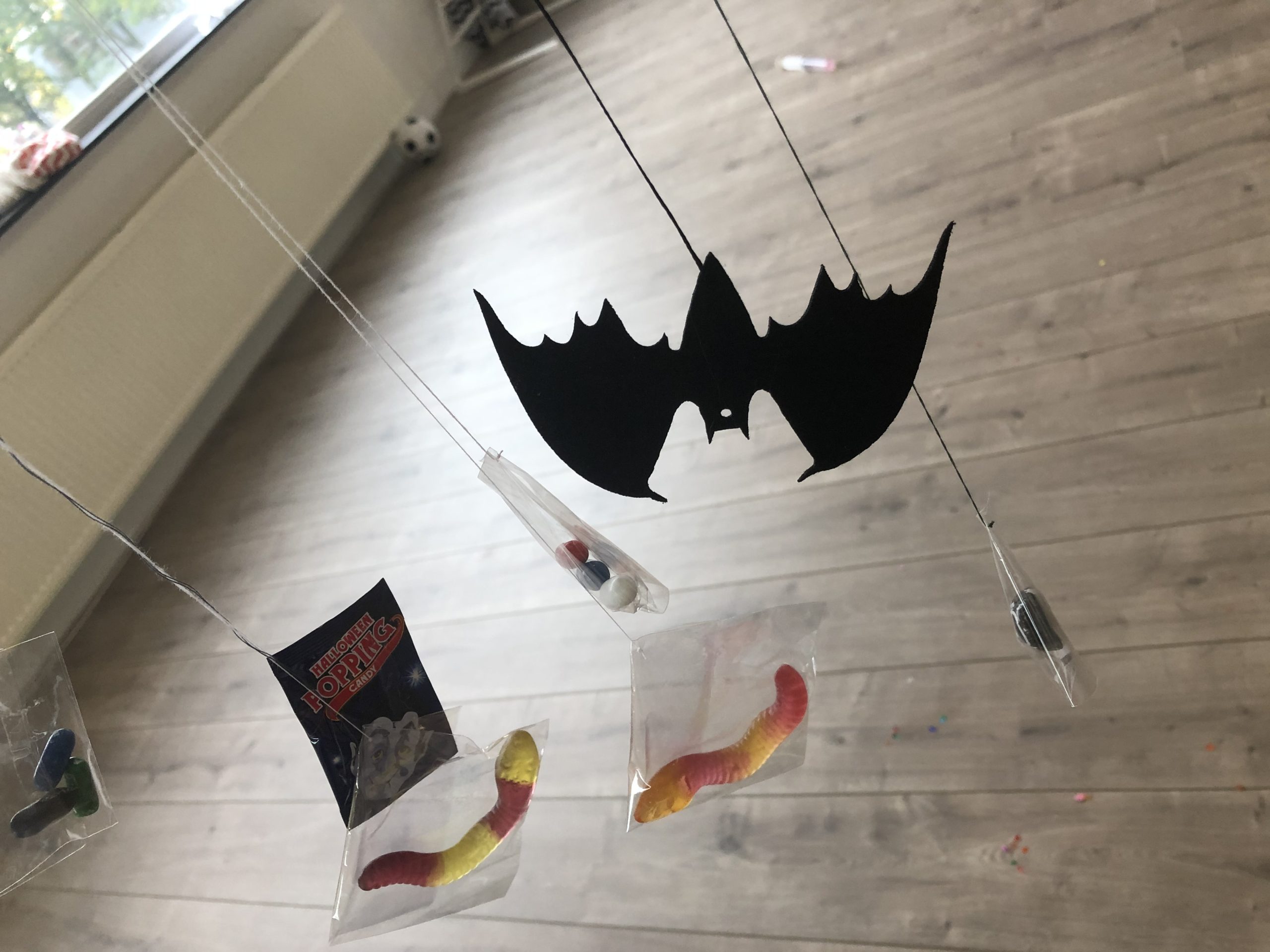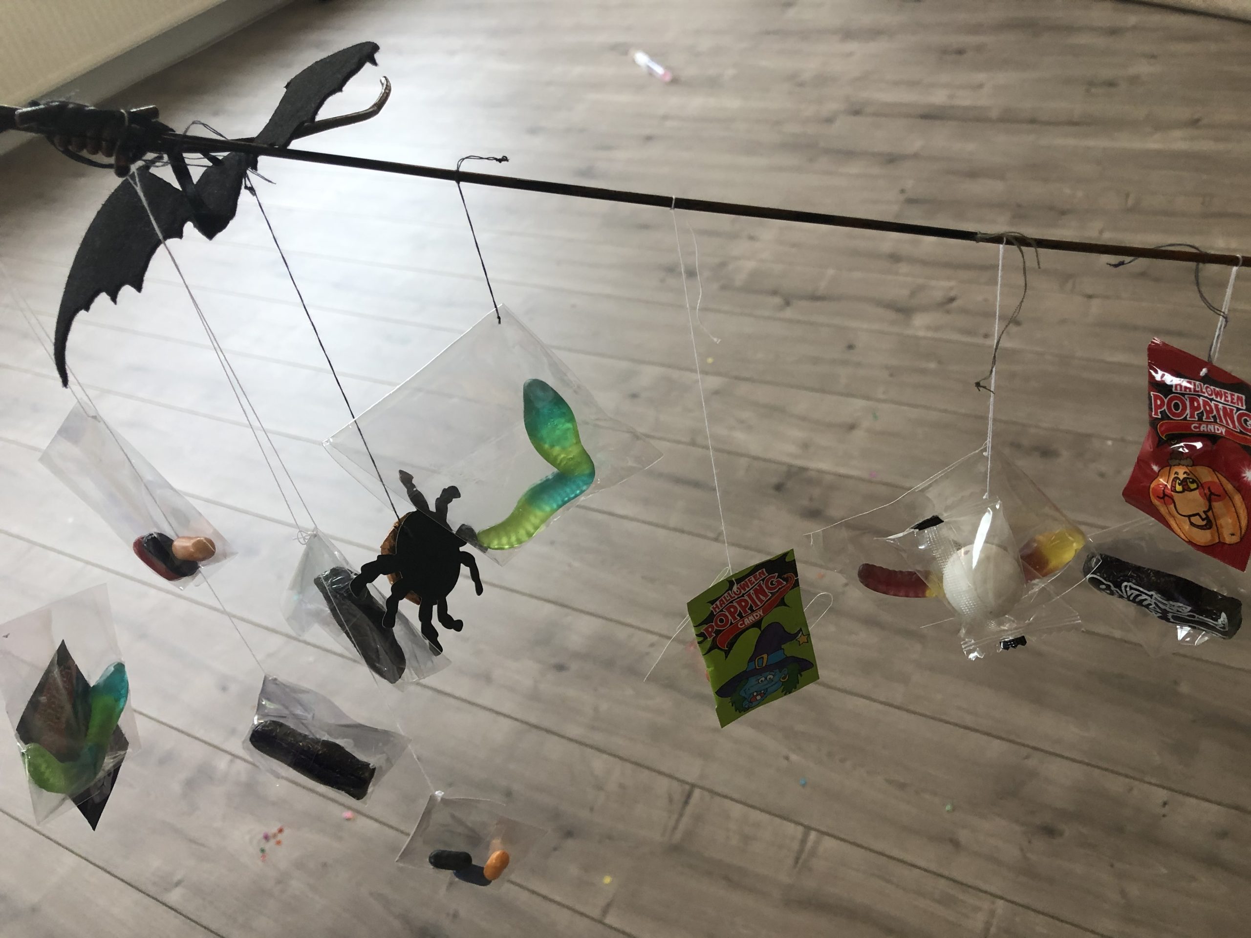 ミミズの形のグミを吊るして